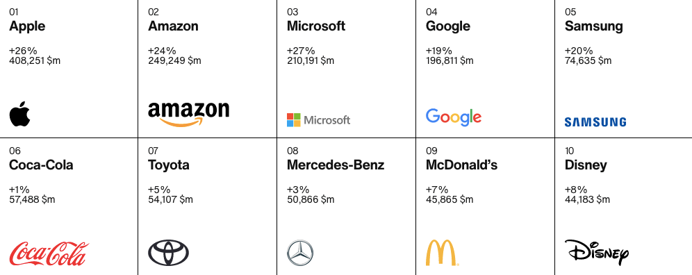A diferencia del año pasado, no hubo ningún cambio dentro en las primeras 10 posiciones de las 100 mejores marcas del mundo. La pandemia de Covid-19 le dió un rápido ascenso a Amazon y a Zoom; Amazon pasó del 3er al 2do lugar, y Zoom entró al ranking por primera vez ocupando el lugar número 100, este año y con la pandemia aún activa Zoom subió al lugar 91 dentro del ranking de 2021.