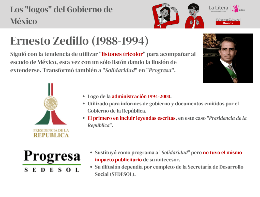 Ernesto Zedillo llegó a la presidencia marcando su distancia de Salinas, y esto se vió reflejado en su interés por dejar una marca propia que lo diferenciara de su antecesor. Es así como llega este logo con un listón emulando extenderse a lo largo, teniendo en medio al Escudo Nacional; además de ser el primer logo en incluir una leyenda escrita, que en este caso es «Presidencia de la República».
