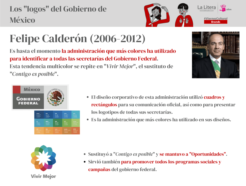La administración de Felipe Calderón, además de utilizar cuadros y rectángulos para su ecosistema visual, aplicó un color único para cada secretaría de estado, convirtiéndose en la adminstración que más colores ha aplicado en su branding gubernamental.
