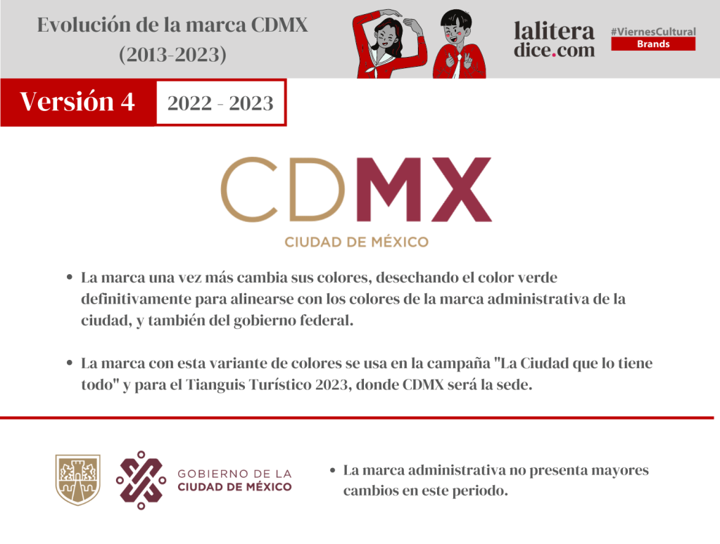 Este 2023, la Ciudad de México será por primera vez la sede del Tianguis Turistico, por lo que la última versión de la marca CDMX hace presencia en el logo de la edición 2023. (Y donde se muestra, una vez más, que CDMX se muestra en un tamaño más pequeño si lo comparamos con el logo del Gobierno de la Ciudad de México, o el Gobierno de México).