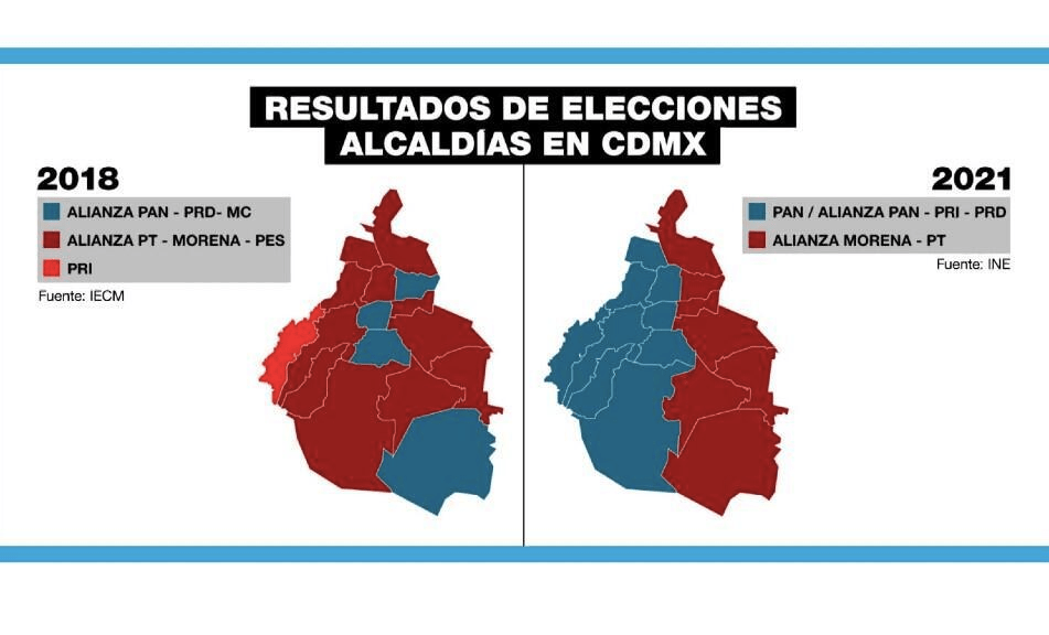 En junio de 2021, la Ciudad de México se partió perfectamente en 2, pues la primera mitad (y la mayoría de las alcaldías) fueron ganadas por el bloque opositor PAN-PRI-PRD. Mientras que la otra mitad fue ganada por Morena, el partido de Claudia Sheinbaum.