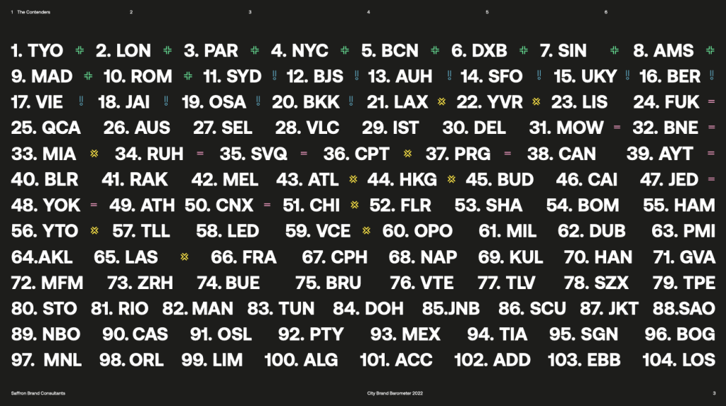 Lo grave aquí es que, en el Top 100 de marcas ciudad de la consultora Saffron, en 2022 CDMX ha descendido hasta el lugar número 93.