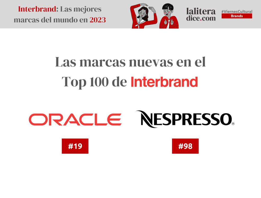 Las nuevas marcas que llegaron por primera vez al Top 100 de marcas de Interbrand son Oracle y Nespresso. Oracle ocupa el lugar 19 con un valor de 34,622 millones de dólares; mientras que la marca Nespresso ocupa el lugar 98 con un valor de 6,168 millones de dólares.
