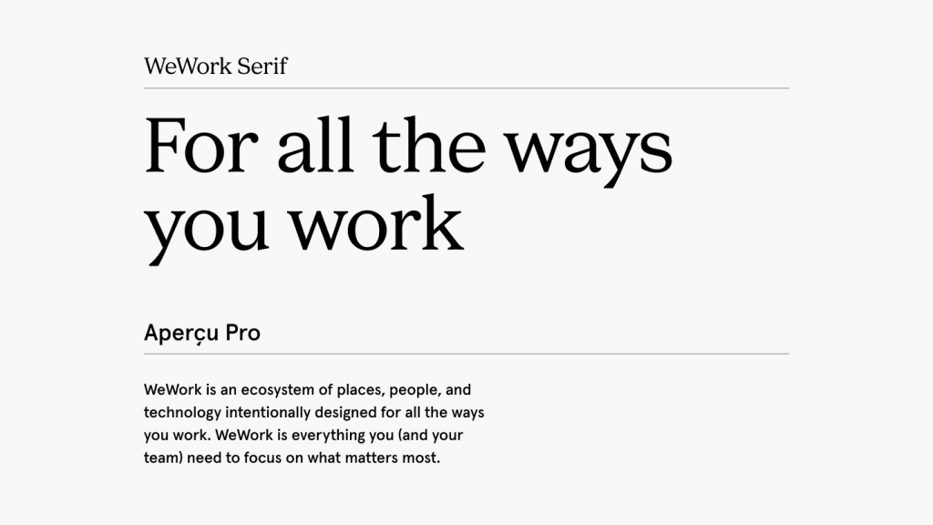 En colaboración con Franklyn, A+ desarrolló una nueva tipografía para la marca, llamada WeWork Serif, que sirve para encabezados y que sigue el estilo tradicional y elegante que la marca ha manejado desde hace años. De igual manera, la letra secundaria, Aperçu Pro, para todo el cuerpo de texto.