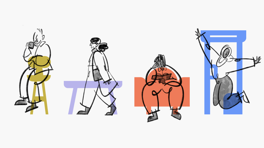 Estas ilustraciones tienen dos estilos. El primero con dibujos planos muestran la paleta de colores secundarios para darle vida a los objetos que representan los espacios que WeWork ofrece; mientras que las personas, conviviendo en ese entorno, son representadas con un estilo de dibujo en movimiento.