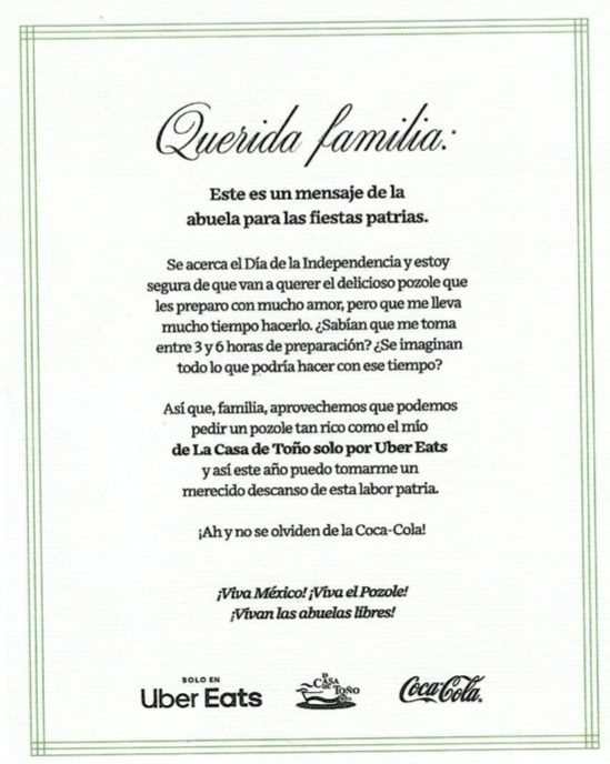 Es por ello que, de manera ingeniosa, Uber Eats se alió con La Casa De Toño y Coca Cola para que las abuelas puedan descansar en las fiestas patrias. Esta colaboración ingeniosa permite que las abuelas disfruten de los platillos sin tener que preocuparse por cocinar y tener más tiempo para disfrutarlo con sus seres queridos.
